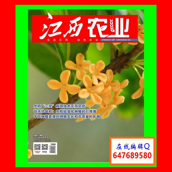 《江西农业》杂志是由江西省农业厅主管,江西省农业技术推广总站主办,《江西农业》杂志社出版,全国公开发行的综合性农业刊物。国际标准刊号:ISSN 1674-4179,国内统一刊号:CN 36-1296/S,邮发代号:44-48。主要栏目:栽培育种(植物栽培、种植、中草药种植等方面文章);景观农业(花卉种植等方面文章);畜牧兽医(畜牧养殖、兽医等方面文章);加工贮藏(中草药加工、农作作物加工贮藏);农业气象(农业气候,气象等方面文章);农田水利(农田、水文、农业水利工程、水库、农田管理技术等方面文章);农业资源与环境(农业环境治理、农业能源等方面的文章);新型农业(特色农业、新兴农业、互联网农业等方面文章);农业资讯(农业信息、农业就业、农业法制性问题、农业教育等方面的文章)等。