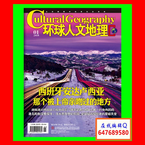 《环球人文地理》杂志是经国家新闻出版广电总局批准,由中华人民共和国教育部主管,由西南大学、21世纪人才报社主办的综合性学术刊物。国际标准刊号:ISSN 2095-0446,国内统一刊号:CN 50-1203/K,邮发代号:78-135。主要栏目设置:卷首、人文论坛、策划、第一看点、地理发现、人与自然、视觉21、功夫地理、地理研究、国土资源、生态环境、地质勘察、旅游开发、历史文明、民俗研究、人文教育、文化万象等。本刊影响力:本刊系K类专刊,中国核心期刊(遴选)数据库全文收录,中国知网、万方数据库、维普中文期刊全文收录。
